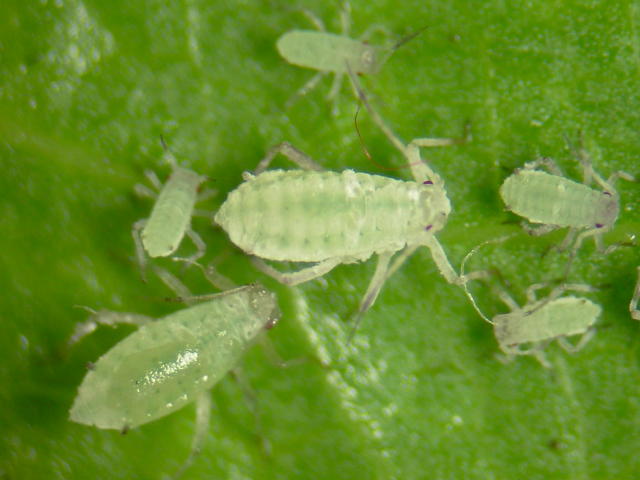 モモコフキアブラムシ成虫(体長2.2mm)及び幼虫