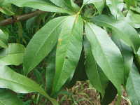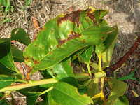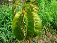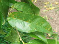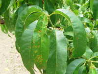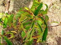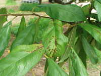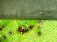 | 発生時期:7月 病原:細菌 伝染方法:発病枝上の細菌が雨により伝染する。 被害:葉に黒褐色病斑を生じ、後に孔が空く。 |