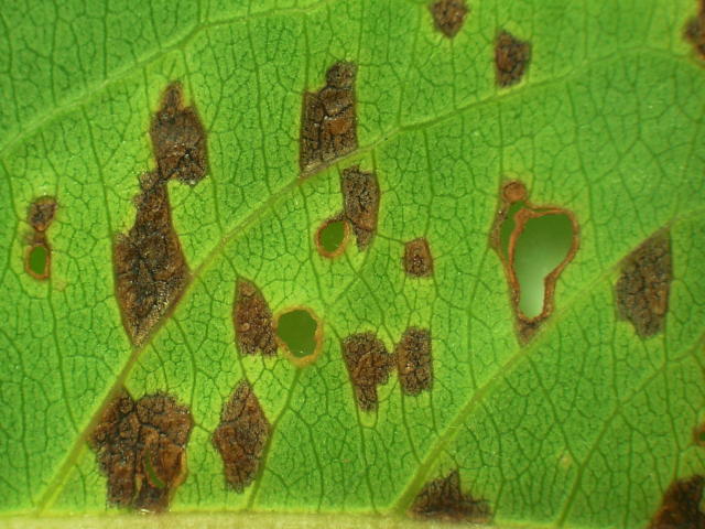 せん孔細菌病 葉脈に囲まれた不整形病斑(葉裏)