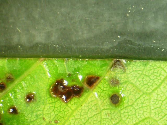 せん孔細菌病 葉を水に漬けると白い菌泥が出る