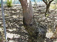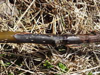被害:枝や幹に赤褐色の楕円形大型病斑を生じる。