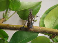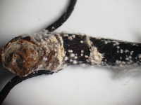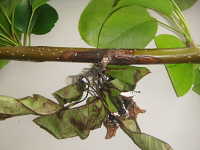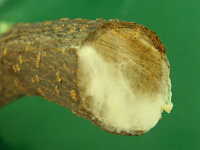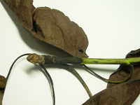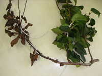 | 発生時期:5月〜6月、9月 病原:糸状菌(かび) 伝染方法:病原菌は土壌中に潜在し、雨水のはねあがりなどにより飛散し、感染する。 被害:枝の基部が黒変して枯れ、果そう部がしおれる。 |