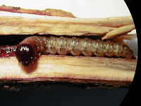 被害:幼虫による枝内の食害 参考:食入口は木くずや糞を糸で綴り合わせたものである。
