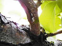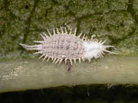 | 発生時期:4月〜9月 被害:成虫及び幼虫の吸汁により、果実の吸汁部がでこぼこになる。排泄物にすす病が発生する。 |