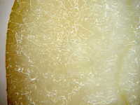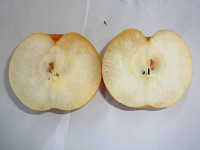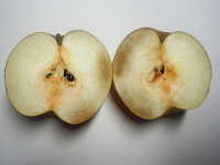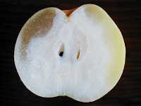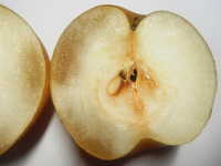 | 発生時期:収穫期 発生原因:収穫の遅れ。気象要因(7月が低温の年。7月が多雨で、8月が急に高温・乾燥になった年。8月が高温・乾燥で9月に雨が多い年。) 被害:果肉に水浸状で透明な部分ができ、品質・日持ちが低下する。 参考:品種では豊水に発生しやすい。発生果実はコンポート(薄い砂糖水で煮る)にすれば、おいしく食べられる。 |