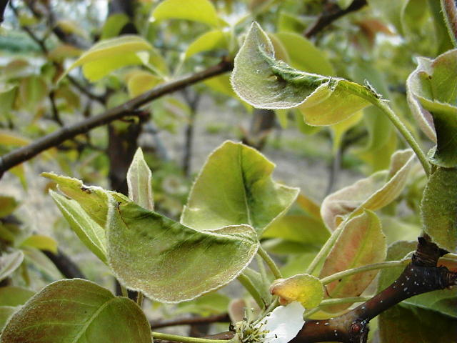 ナシキジラミ 若齢幼虫の寄生による葉の縮れ(4月中旬)