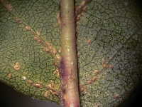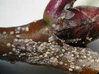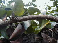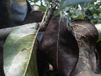 | 発生時期:6月〜9月 被害:成虫及び幼虫の吸汁により、枝葉が枯死する。果実に寄生すると奇形果や裂果になる。 |