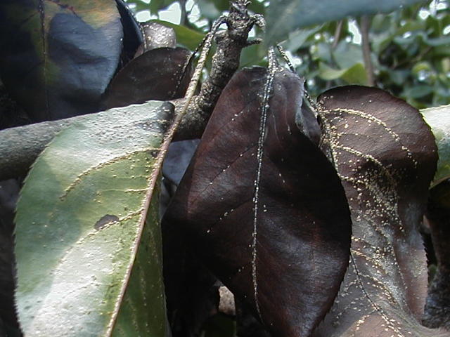 ナシマルカイガラムシ 多数寄生された葉は枯死する