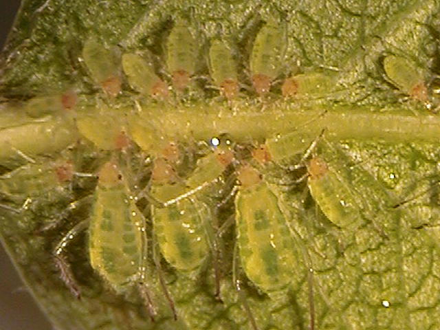 ナシミドリオオアブラムシ成虫(体長3mm)及び幼虫