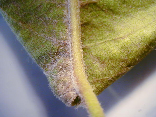 ニセナシサビダニ 変色の著しい葉裏基部