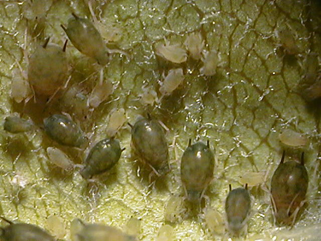 ワタアブラムシ成虫(体長1.5mm)及び幼虫