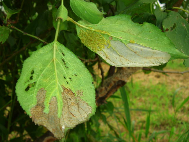 ヒロへリアオイラガ若齢幼虫による被害葉