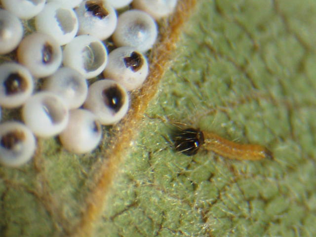 モンクロシャチホコ卵(直径0.8mm)及び孵化直後幼虫(体長1.8mm)