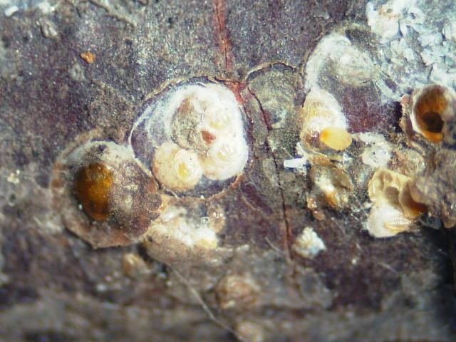ウメシロカイガラムシ雌成虫(直径2mm)