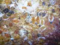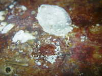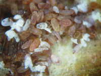 雌成虫(体長1mm)とカイガラ(直径2mm)