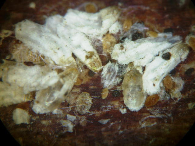 ウメシロカイガラムシ雄繭(全長1mm)及び幼虫(体長0.3、0.6mm)