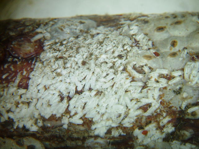 ウメシロカイガラムシ雄繭のコロニー
