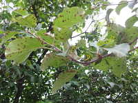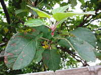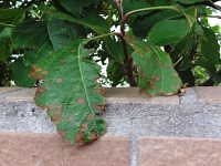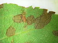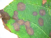 被害:葉に暗褐色円形病斑を生じ、進展すると黄化、落葉する。
