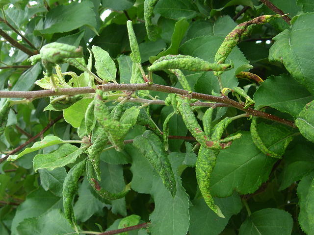 リンゴコブアブラムシ 寄生葉は巻いてコブができる