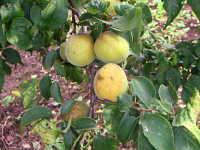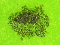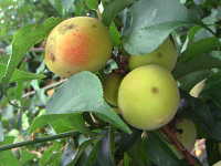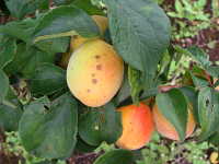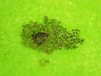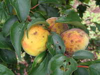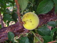 被害:果実と新梢に発病し、黒褐色の円形病斑を生じる。