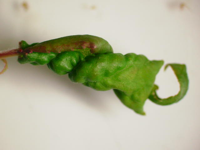 ムギワラギクオマルアブラムシ 寄生葉は巻葉となる
