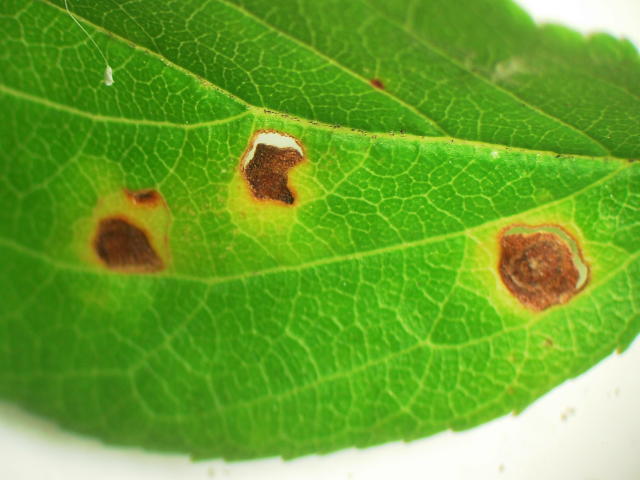 褐色せん孔病 病斑はやぶれて孔があく