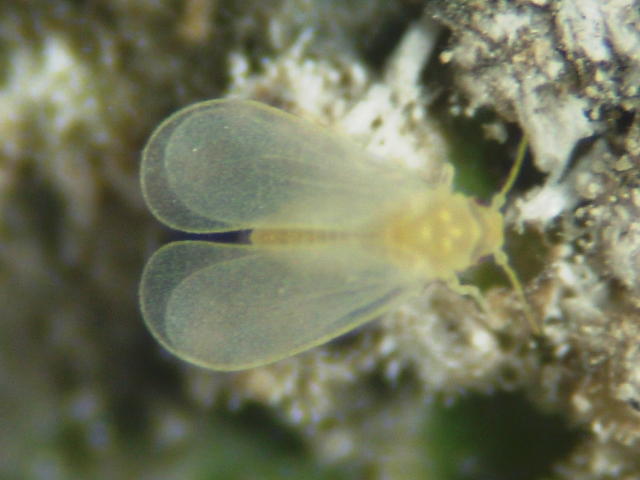 ザクロシロトゲコナジラミ成虫(全長1mm)