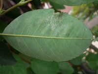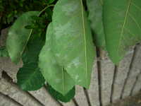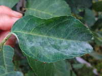 被害:葉にうどんこ状の病斑を生じる。 参考:乾燥気味の年に発生しやすい。
