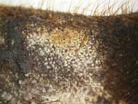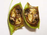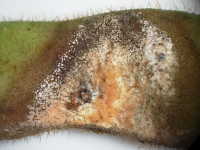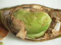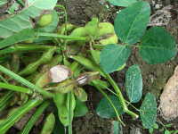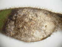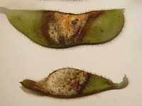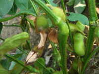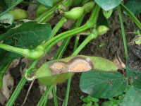 | 発生時期:8月 病原:糸状菌(かび) 伝染方法:土壌中に残った発病さや上の病原菌が伝染源となる。 被害:さやに白色〜橙色の病斑を生じ、内部の子実は腐敗する。 |