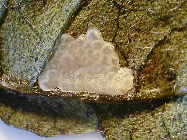 アズキノメイガ卵塊(魚のうろこ状に並び卵直径0.7mm)