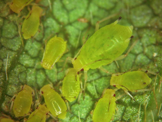ダイズアブラムシ成虫(体長1.8mm)及び幼虫(体長0.9mm)