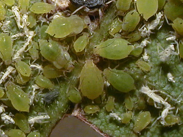 ダイズアブラムシ成虫(体長2mm)及び幼虫