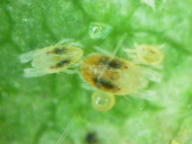 カンザワハダニ卵(直径0.13mm)、幼虫(体長0.2mm)、第1若虫(体長0.25mm)、第2若虫(体長0.35mm)