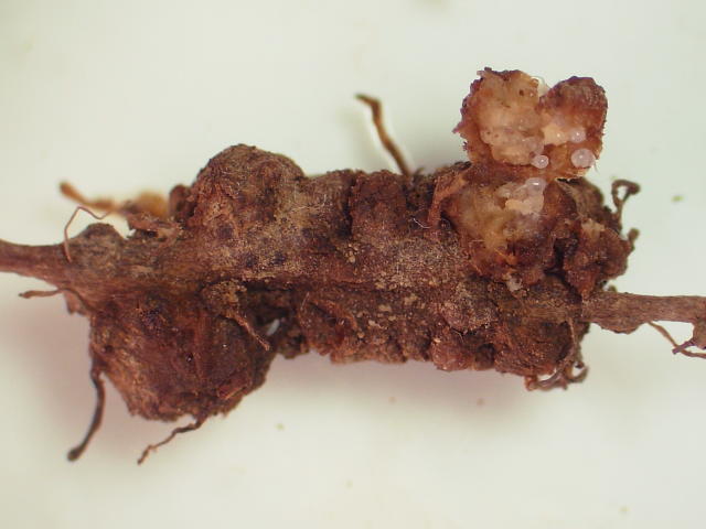 ネコブセンチュウ ネコブ(長さ13mm)と雌成虫