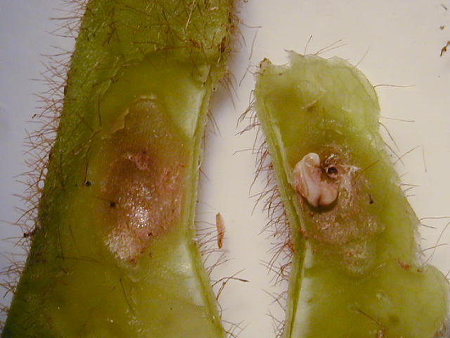 ダイズサヤタマバエ成虫羽化後の被害莢と被害子実
