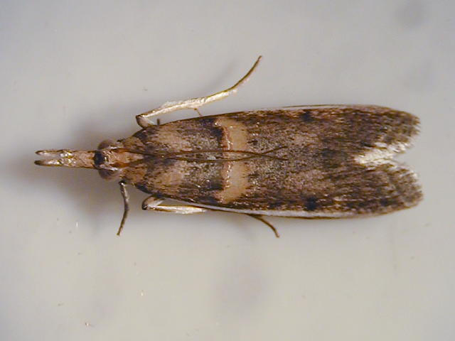 シロイチモジマダラメイガ成虫(前翅に白い一文字模様がある)