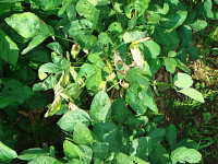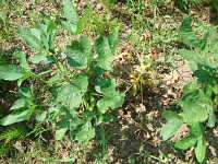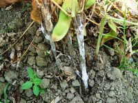 | 発生時期:8月〜10月 病原:糸状菌(かび) 伝染方法:土壌中に残った発病葉上の病原菌が伝染源となる。また、土壌伝染する。 被害:地際部に黒変して白いかびを生じ、葉が次第に枯死し、発病が進むと株全体が枯死する。。 |