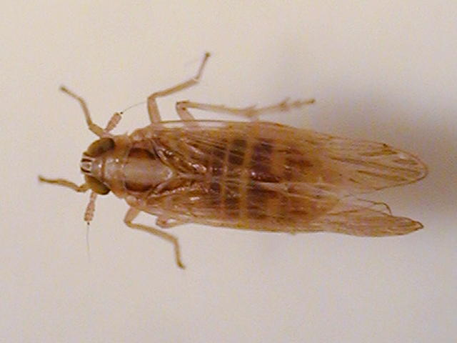 ヒメトビウンカ雌成虫(体長4mm、腹が大きい)
