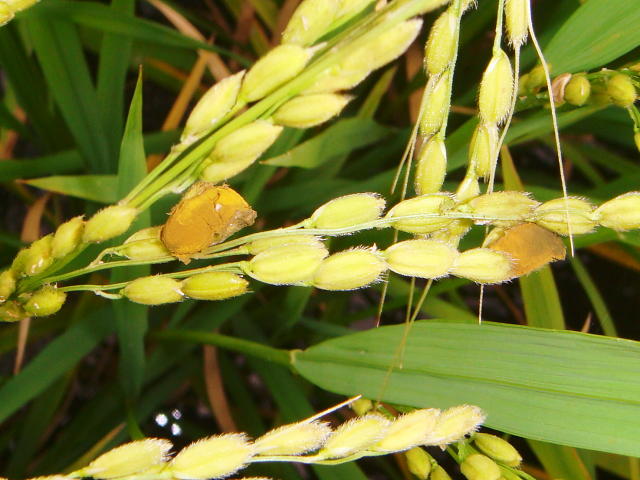 稲こうじ病 発病初期はもみを黄褐色の塊が覆う