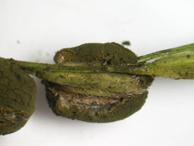 稲こうじ病 黒い厚膜胞子が飛んで、周囲の籾が汚れる