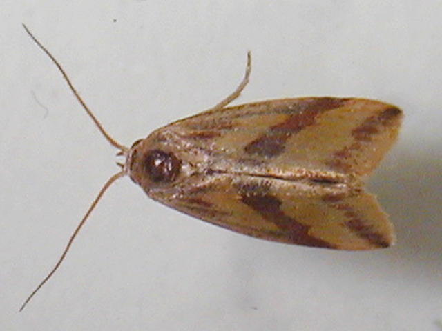 イネアオムシ雄成虫(フタオビコヤガ、体長8mm)