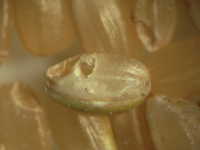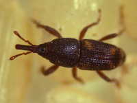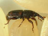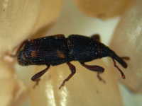 被害:成虫は口吻で玄米に穴を空けて食害する。玄米内の卵から孵化した幼虫は玄米を食い荒らす。