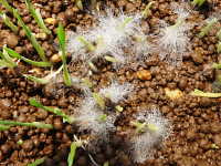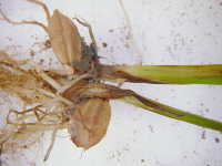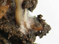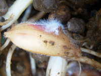 被害:出芽中の種籾の周囲に白いカビが生える。病原菌はイネ苗の組織内に侵入できないが、毒素を生産してイネ苗の生育を阻害する。