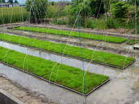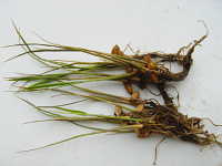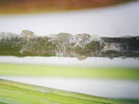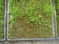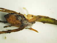 | 発病時期:育苗期 病原:糸状菌(かび) 伝染方法:病原菌は野菜の苗立枯病と同じである。土壌中に残った被害植物上で菌核及び休眠菌糸として生存して伝染源となるため、野菜作後の土壌を用いると多発生する。発育適温は20〜30℃。 被害:移植約1週間前の種籾に急に発生し、葉先がしおれたり、葉腐れ症状を呈する。葉腐れ部分に蜘蛛の巣状の菌糸が見られ、白色の菌核を生じる。 |