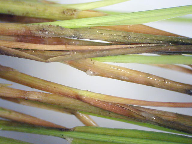 苗立枯病 葉腐れ部分に白色菌核を形成