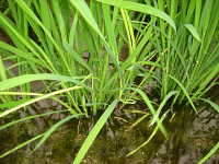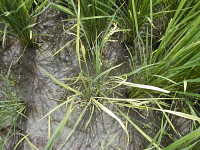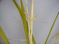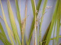 | 発生時期:生育初期〜出穂期 病原:ウイルス 伝染方法:ヒメトビウンカが病原ウイルスを媒介する。(このウイルスは卵を通じて次世代へ伝染される:経卵伝染という) 被害:新葉がこより状に巻いて垂れる(ゆうれい症状)。重症株は枯死する。出穂しても、出すくみや不稔となる。 参考:昭和50年代は最重要病害であったが、その後イネ縞葉枯病抵抗性品種(むさしこがね→朝の光→彩のかがやき等)の作付増加に伴い、ヒメトビウンカの病原ウイルス保毒率が下がったため、発生が減少した。ただし、コシヒカリ、キヌヒカリは感受性品種であるので、今後も注意が必要。 |
