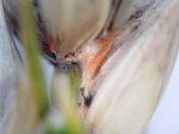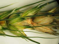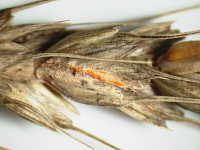 の合わせ目に桃色〜橙色のカビを生じる。また、このカビが産生するかび毒(デオキシニバレノール)は、人や家畜に中毒症状を引き起こすことがあるため、注意が必要である。