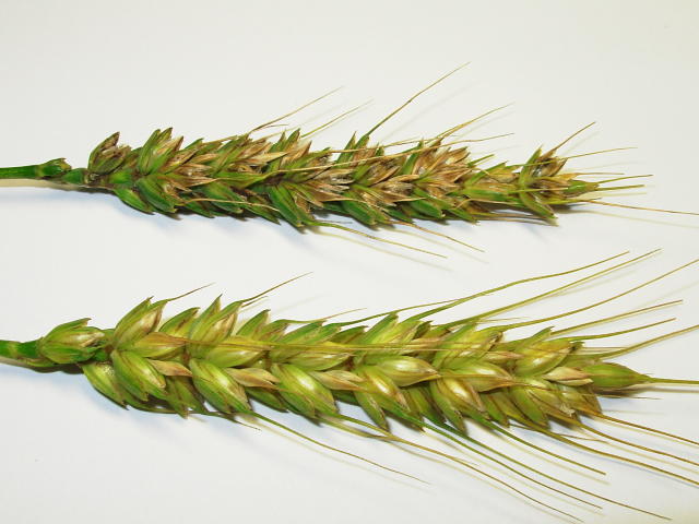 コムギなまぐさ黒穂病発病穂(上)と健全穂(下)
