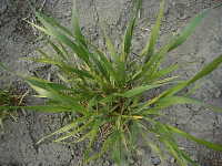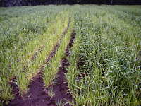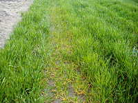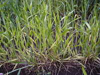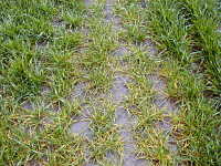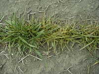 | 発生時期:2月上旬〜4月中旬 病原:ウイルス(オオムギとは別のウイルスで相互には感染しない) 伝染方法:ウイルスを保毒した土壌中のポリミキサ菌が、ムギの根に寄生して感染させる。 被害:葉には縞状又は不規則な退色斑を生じる。軽症株は、茎立ちが始まると症状が消えるが、重症株は草丈が低くなり、出穂しても不稔粒が多くなる。症状の激しい株は黄化枯死することもある。 |