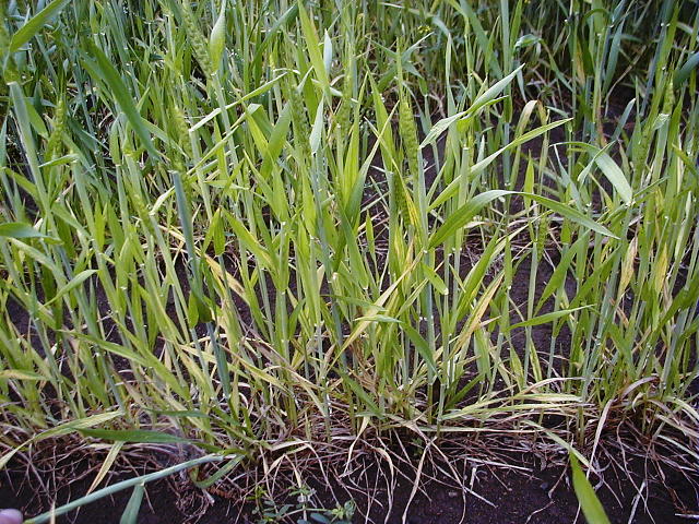 コムギ縞萎縮病 萎縮株は出穂するが、不稔粒が多い